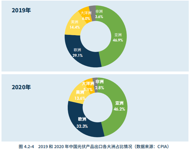得益于欧盟上调减排目标,欧洲市场对光伏装机需求呈现增长趋势。根据欧洲光伏产业协会(Solar Power Europe)发布的欧盟光伏市场展望报告,尽管新冠肺炎疫情给欧洲带来了巨大影响,但是光伏发电在2020年显示出强大的韧性,欧盟成员国新增光伏装机容量为18.2GW,比上一年增长了11%,是自2011年以来的次新高。我国对欧洲地区的出口额约为63.8亿美元,同比增长5.6%,占光伏产品出口总额的32.3%,较2019年增长3.2个百分点,主要出口产品仍以组件为主。对亚洲区域的光伏产品出口额为91亿美元,同比下降6.4%。虽然同比下降,但亚洲仍然是最大的出口区域,在硅片、电池片、组件各环节出口均居首位。对美洲地区的光伏产品出口额约为26.8亿美元,同比下降10.3%。巴西、智利、墨西哥、美国为美洲主要出口市场。对大洋洲的光伏产品出口额约为10亿美元,同比下降19.3%,对非洲地区的光伏产品出口额约为5.6亿美元,同比下降26.5%。非洲地区,南非是第一大组件出口市场,对南非的组件出口额约为1.3亿美元,是出口非洲地区唯一超过1亿美元的市场。